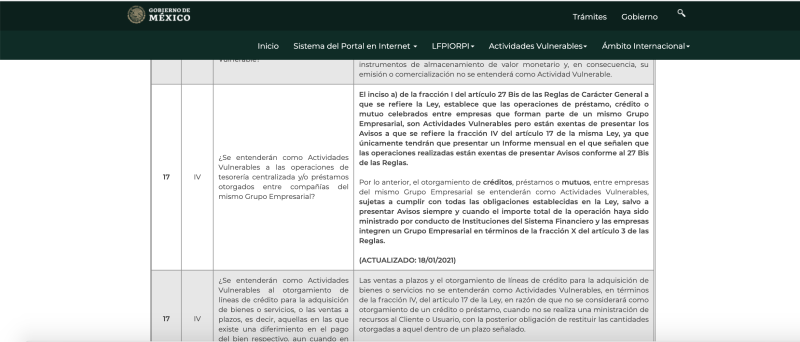 De acuerdo con la autoridad, el otorgamiento de créditos, préstamos o mutuos, entre empresas del mismo grupo empresarial se entenderán como actividades vulnerables, sujetas a cumplir con todas las obligaciones establecidas en la Ley Federal para la Prevención e Identificación de Operaciones con Recursos de Procedencia Ilícita (LFPIORPI), salvo a presentar avisos siempre y cuando el importe total de la operación haya sido ministrado por conducto de instituciones del sistema financiero y las empresas integren un grupo empresarial en términos de la fracción X del artículo 3 de las Reglas de Carácter General de la LFPIORPI.